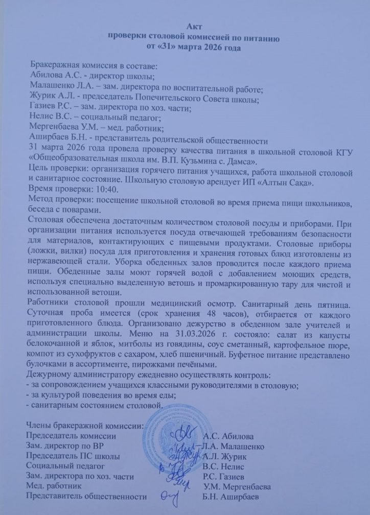 2026 жылдың наурыз айындағы мектеп асханасын тексеру актісі
