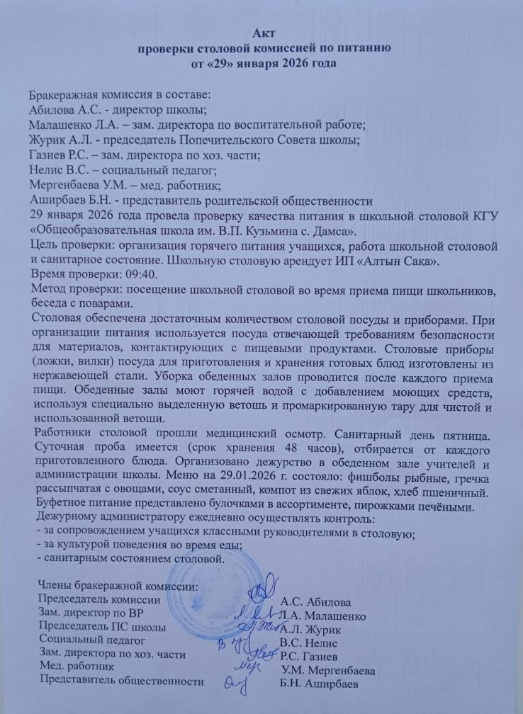 2026 жылдың қантар айындағы мектеп асханасын тексеру актісі