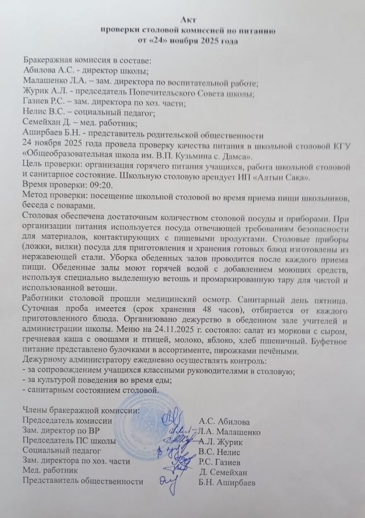 2025 жылдың қараша айындағы мектеп асханасын тексеру актісі