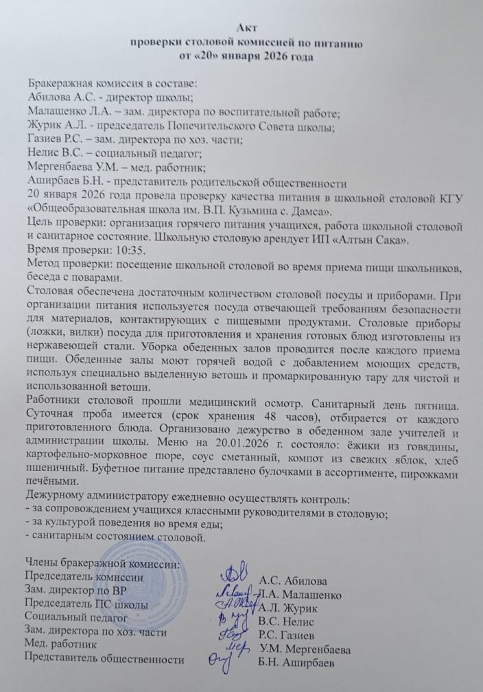 2026 жылдың қантар айындағы мектеп асханасын тексеру актісі