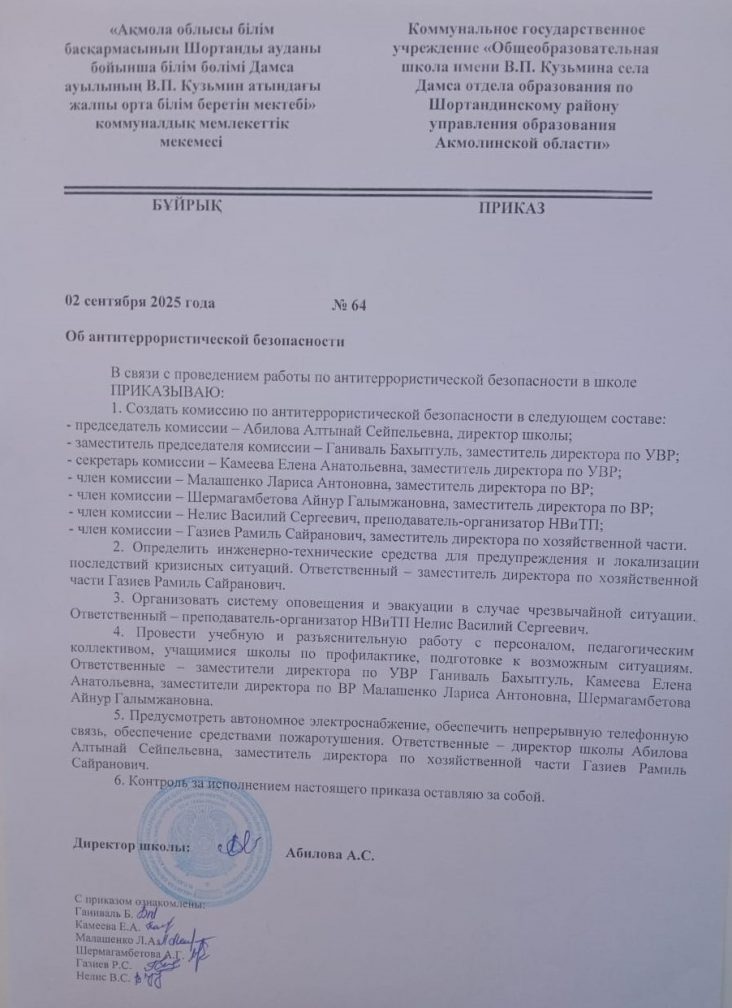 2025-2026 оқу жылына арналған "Терроризмге қарсы қауіпсіздік туралы" бұйрық