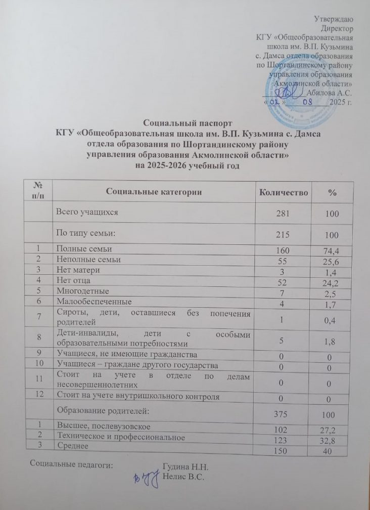 2025-2026 оқу жылына арналған мектептің әлеуметтік паспорты