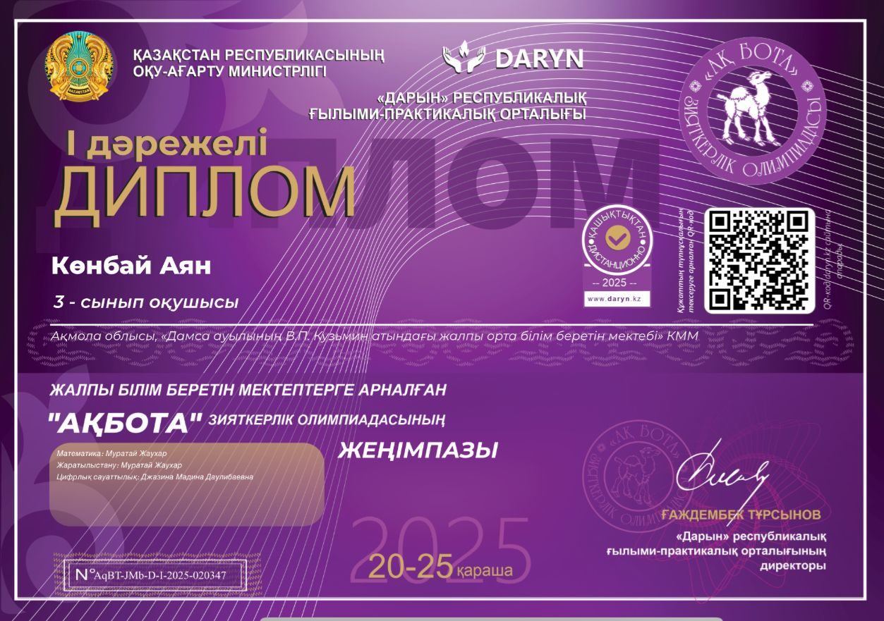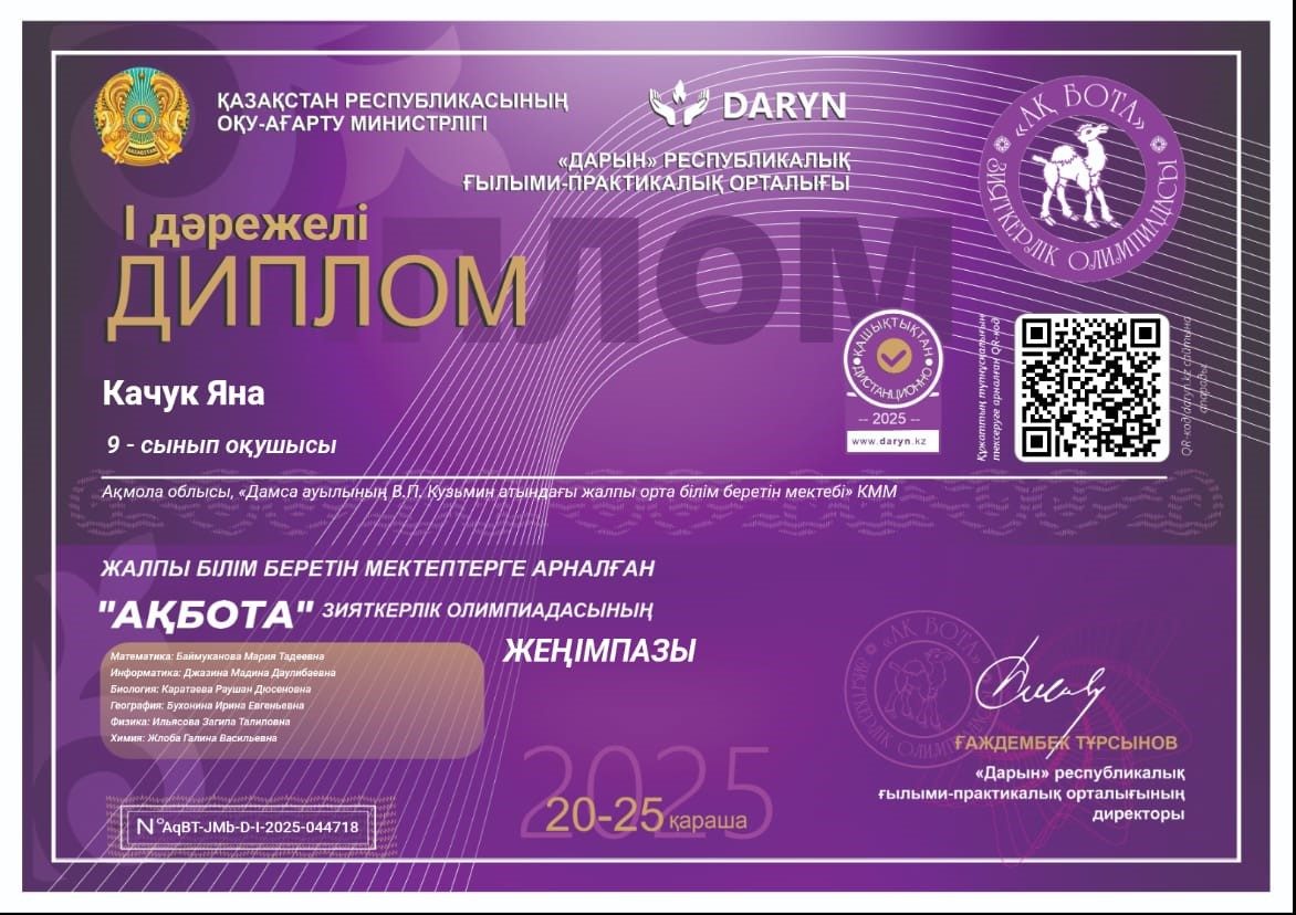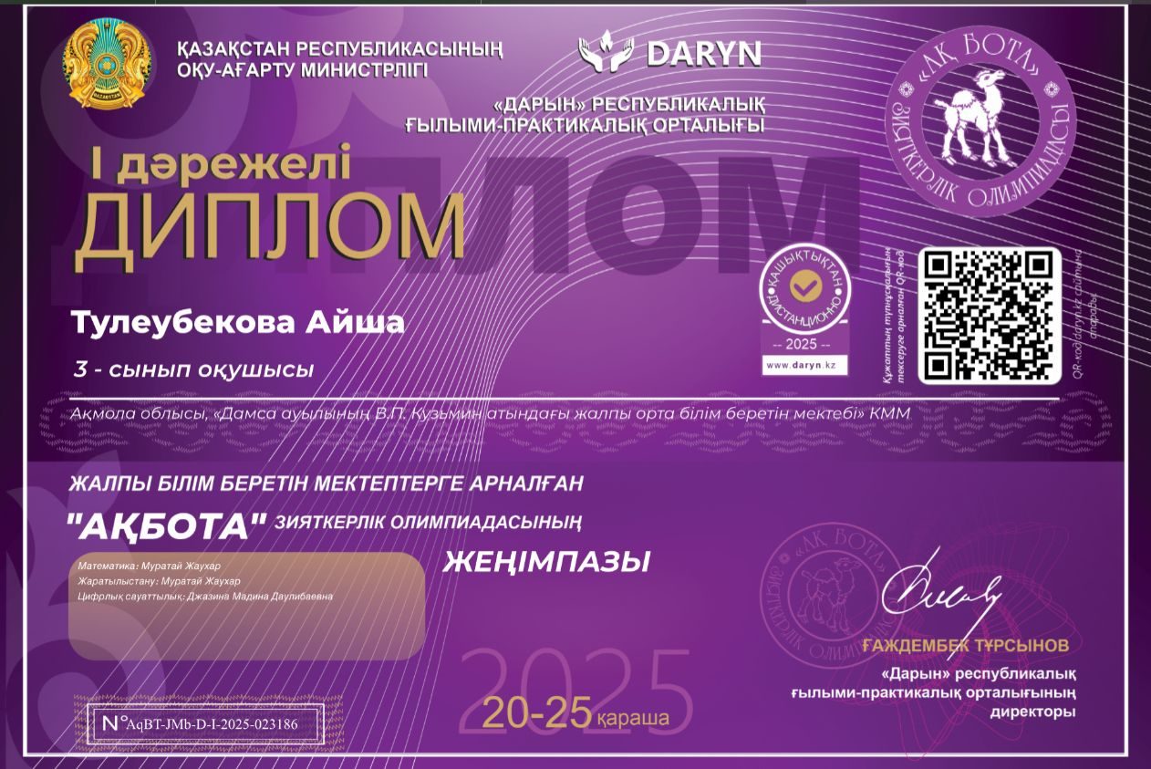 "Ақмола облысы білім басқармасының Шортанды ауданы бойынша білім бөлімі Дамса ауылының В.П. Кузьмин атындағы жалпы орта білім беретін мектебі" КММ. "Ақ бота" олимпиадасының нәтижелері.