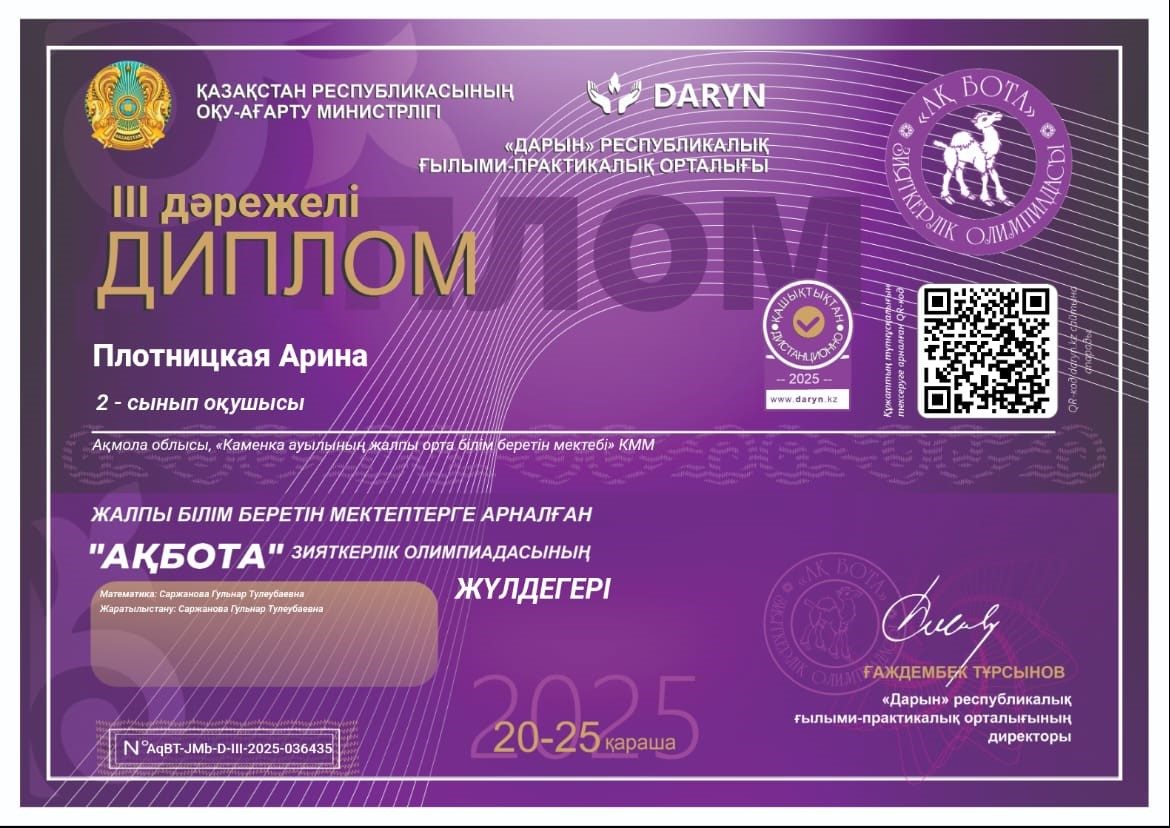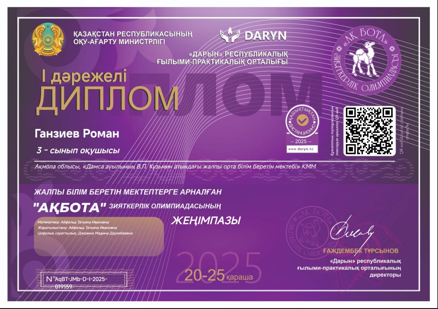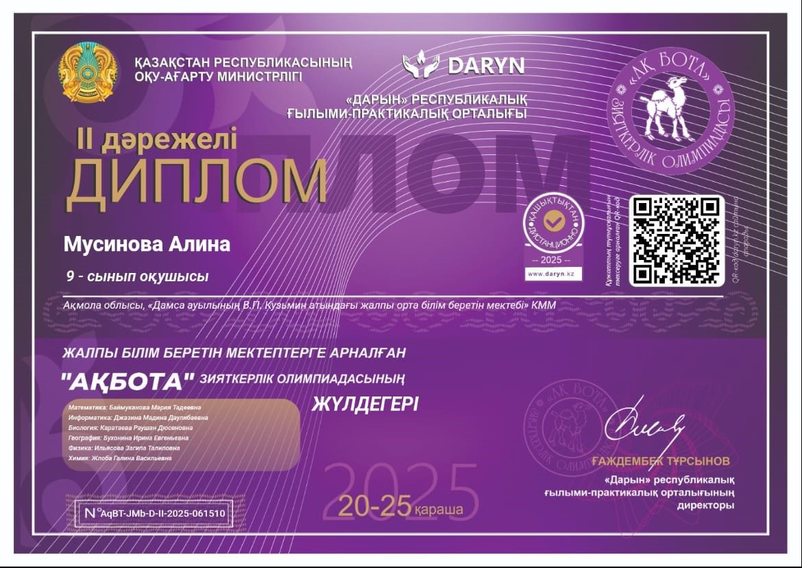 "Ақмола облысы білім басқармасының Шортанды ауданы бойынша білім бөлімі Дамса ауылының В.П. Кузьмин атындағы жалпы орта білім беретін мектебі" КММ. "Ақ бота" олимпиадасының нәтижелері.