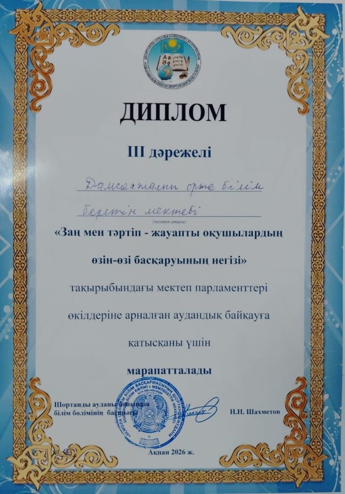 «Ақмола облысы білім басқармасының Шортанды ауданы бойынша білім бөлімі Дамса ауылының В.П. Кузьмин атындағы жалпы орта білім беретін мектебі» КММ. Мектеп парламенттерінің аудандық байқауында үшінші орын.